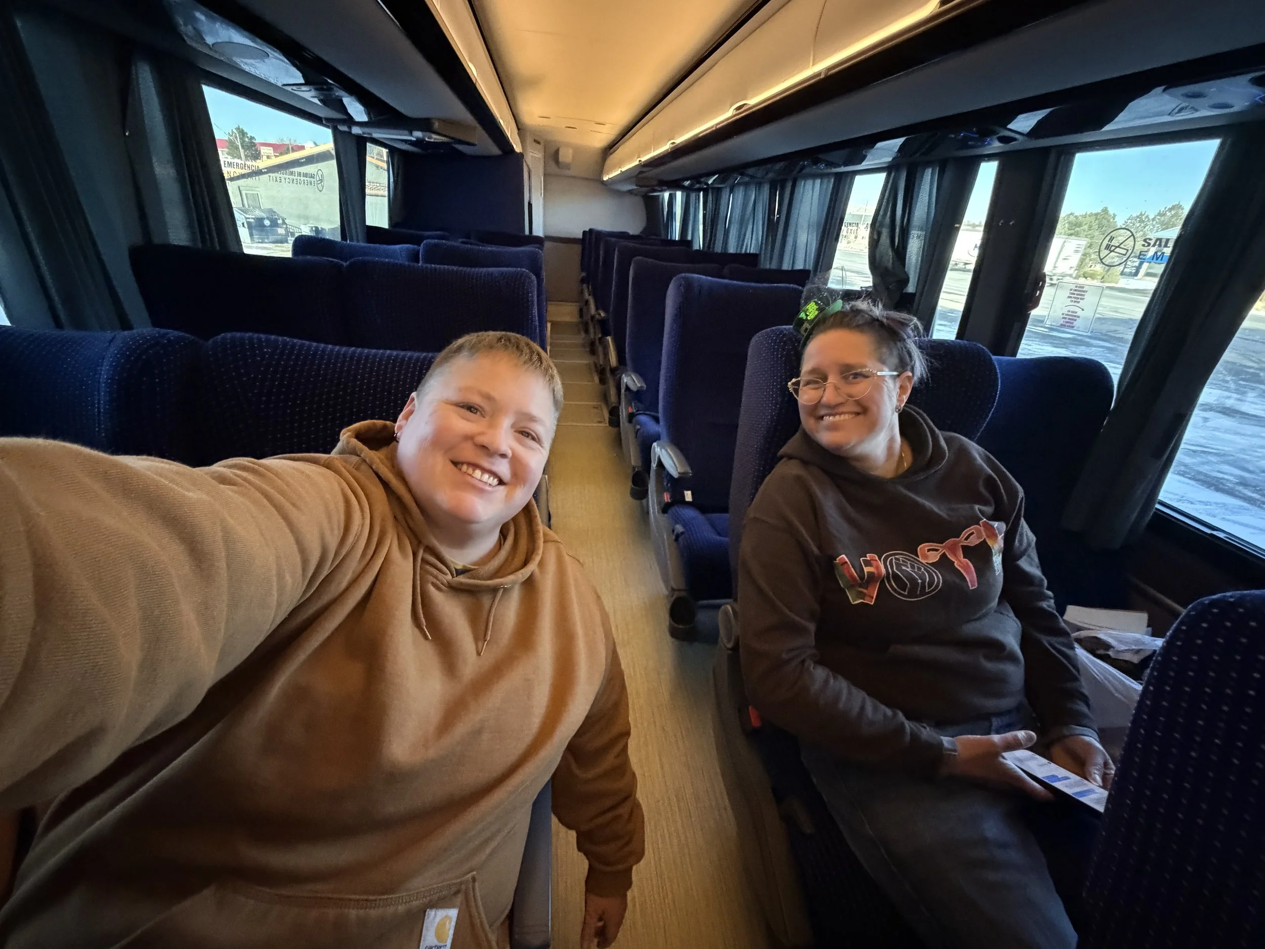 Bus leaving the next day at 4 p.m. After, actually a lot of, research we learned that that there was a bus that left from a gas station and would either take us to Denver or Greeley but Denver was a faster route and we have awesome friends that would some get us.