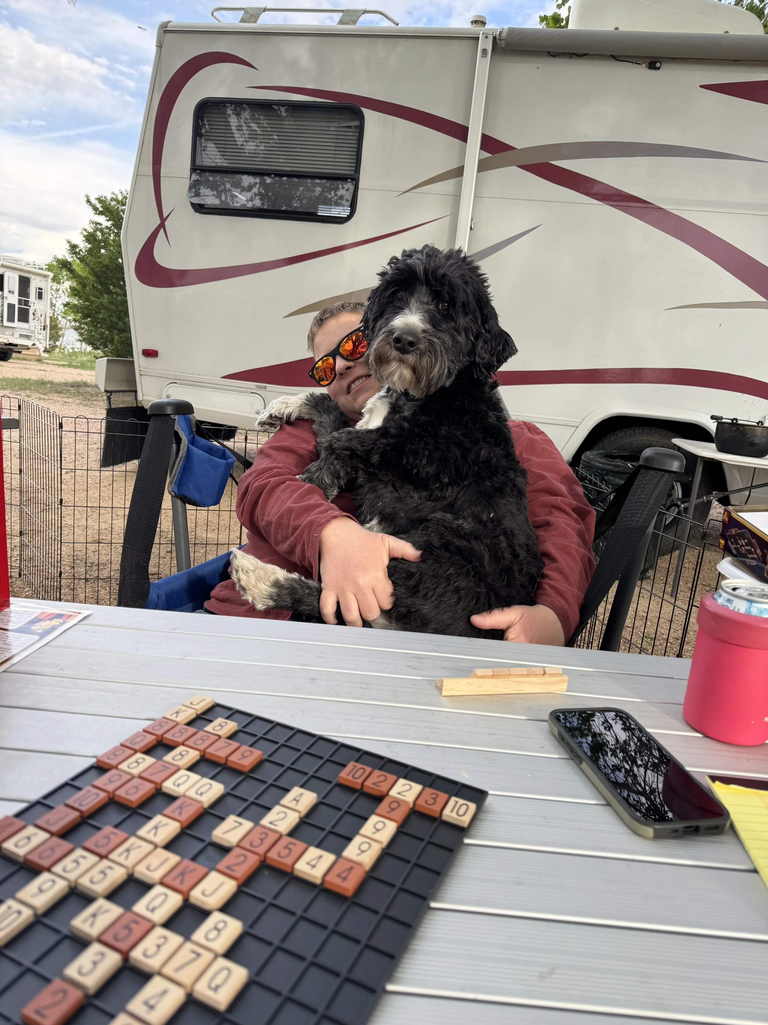 It’s hard enough to deal with at home, but even harder when we travel. He doesn’t like the car, the RV, or any kind of motion. The RV is especially hard—he absolutely loses his mind and insists on being glued to Krissy’s lap the entire time.